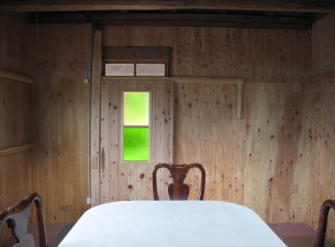 内装壁は、建物の強度を上げるために壁前面に張った構造用合板をそのまま仕上げ材にしいます。天井は当時のままで構造材を表しのままに仕上げています。床は杉の荒板仕上げですが、今はその上に施主様がタイルカーペットを敷き詰めて使用しています。北側出入り口と南側天井の明りとり窓は、施主様支給品のカラーガラスを使用しています。窓や出入り口を増やしたことにより、風がよく通って明るい居心地の良い休憩場所ができました。引き戸裏に書かれていた『大正九年五月九日』の文字は、この建物の歴史を物語るシンボルとして額風に加工し飾りました。 |